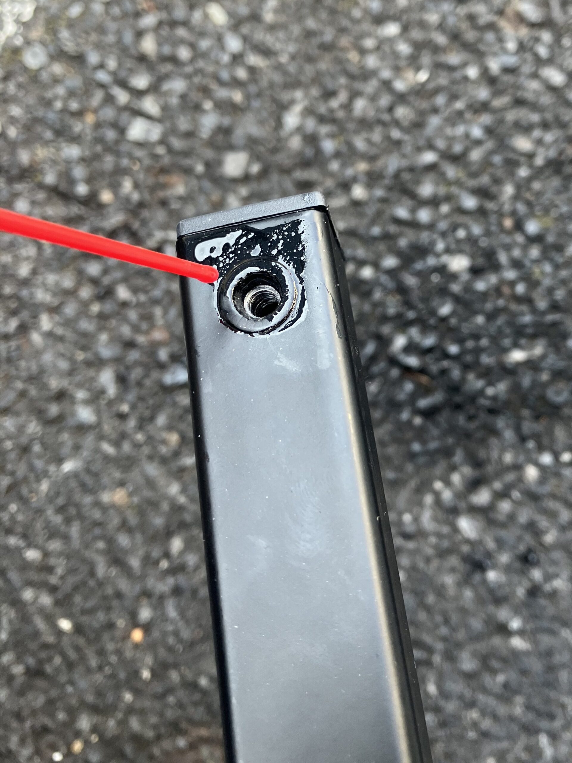 フレームの穴内部およびネジ山に残っていた削りカスでした。