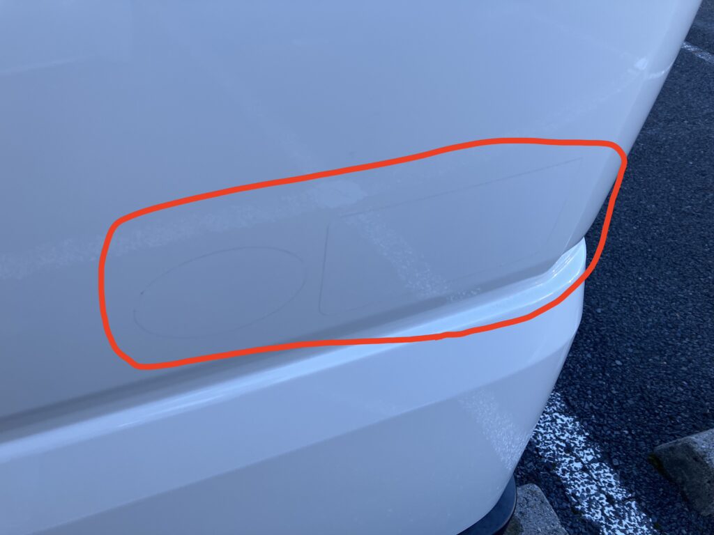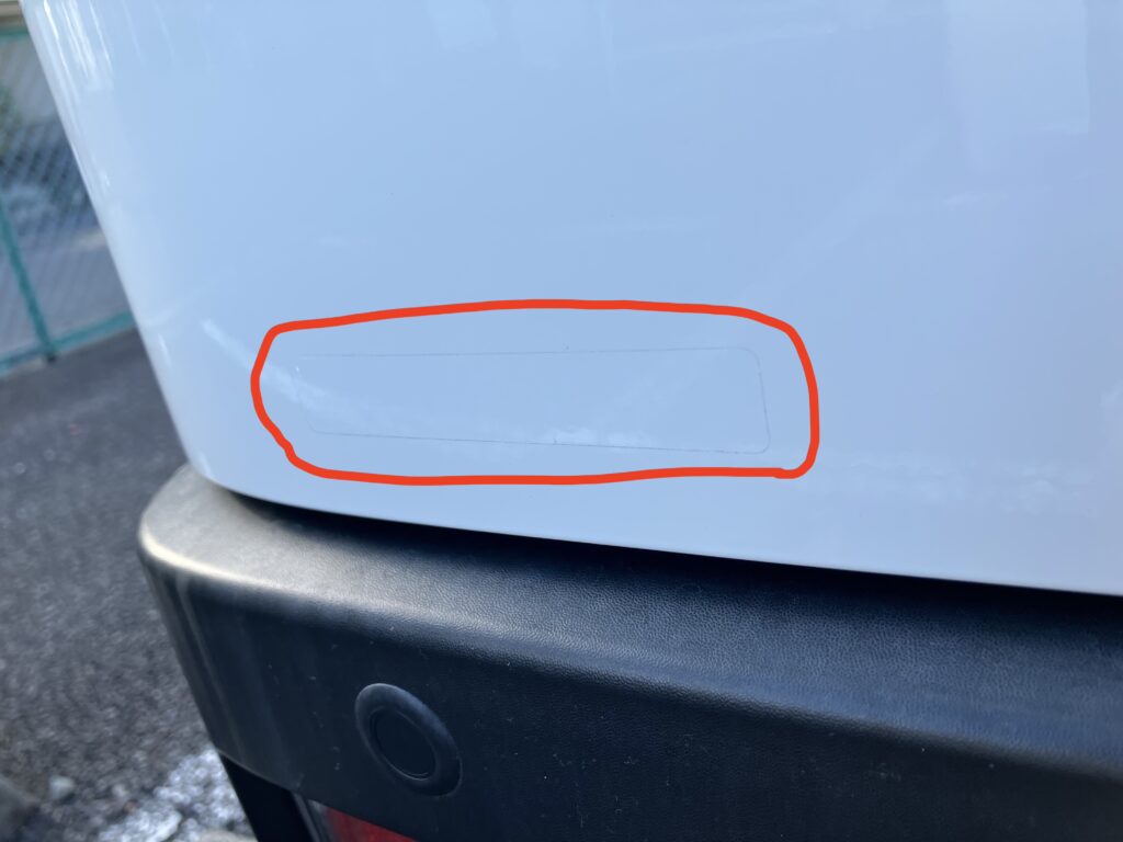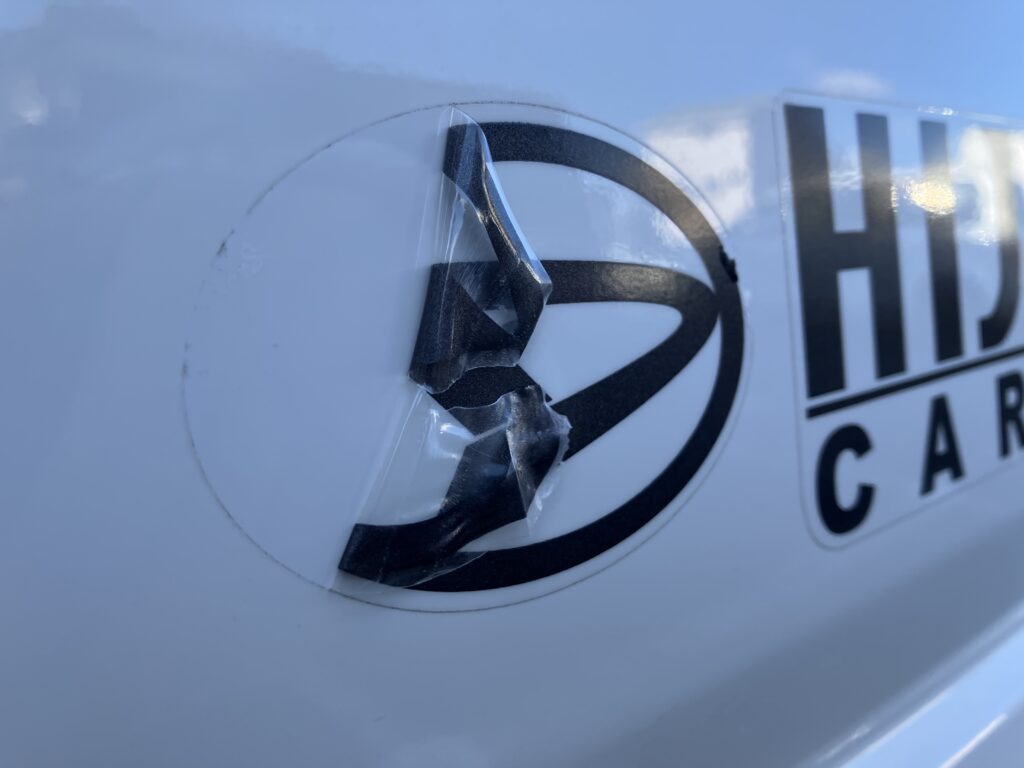 車名のステッカーは意外と剥がしにくい…。縦に切れないよう注意してください。